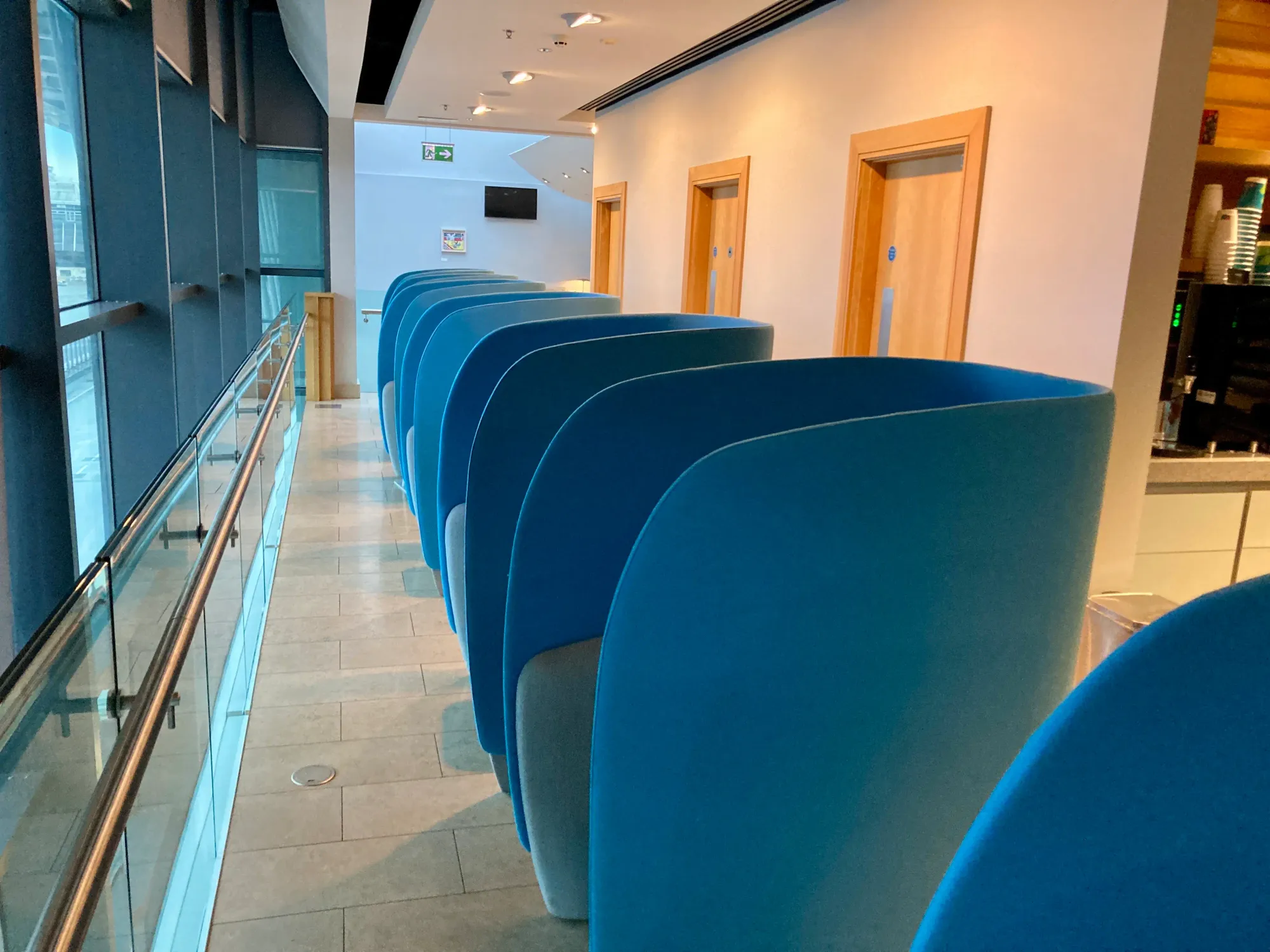 This is where you'll usually find me. Not many people seem to know it's there because it's always empty. It's officially the quiet zone and it has the showers too. I love the big shell seats. They're comfy and if you have some time to spend in the lounge, this is where to go. There's a small coffee dock up here too so you don't have to walk downstairs.