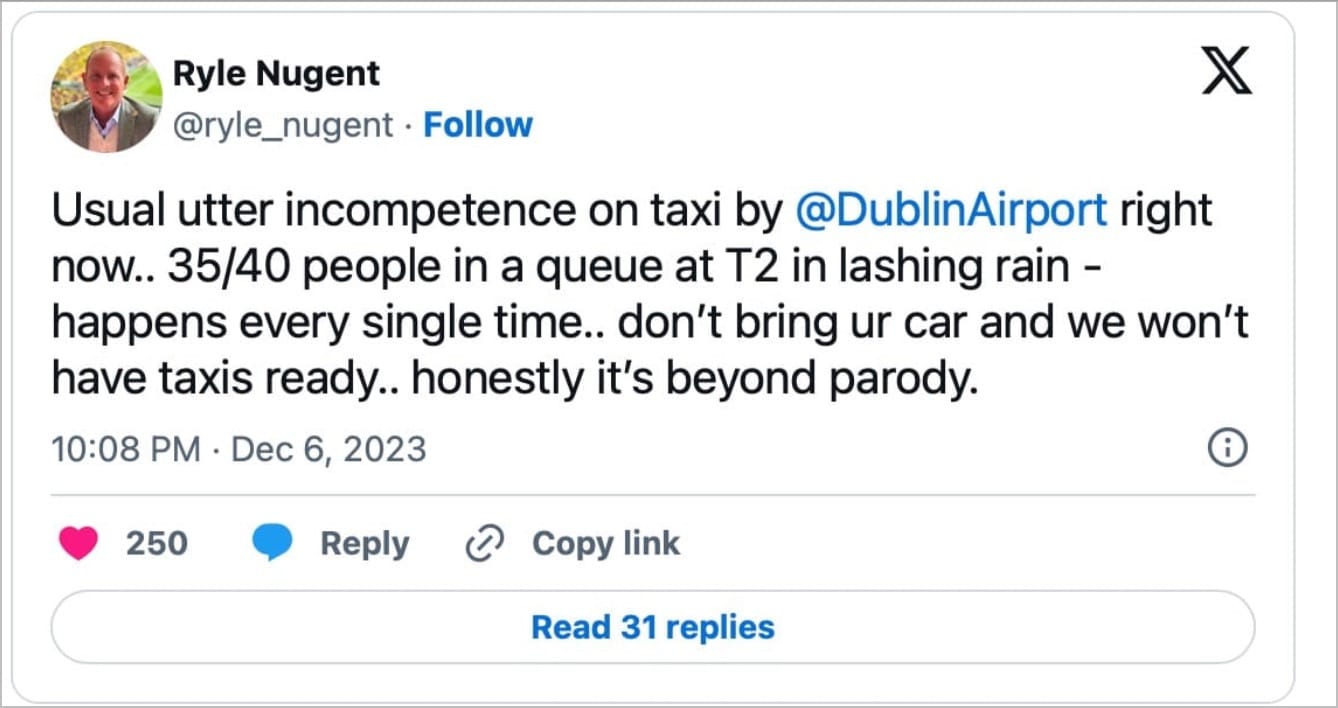 Dublin Airport: There can be taxi shortages. See below. I book a private transfer if I'm arriving very early or very late.