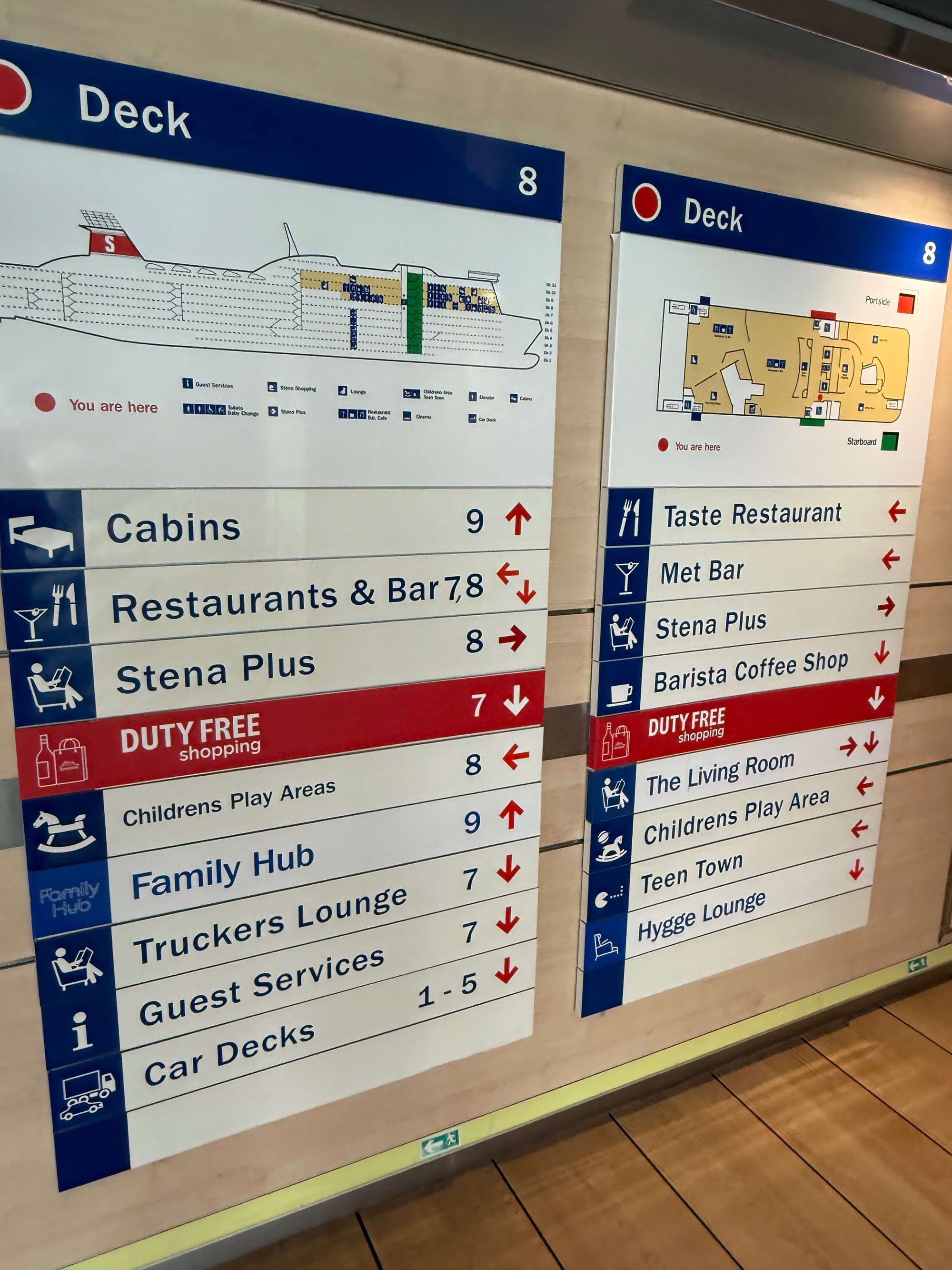Once land was out of sight, I went to explore the ship. For a 22 year old ship, it was very comfortable. Decks 7 & 8 had a variety of seating areas, cafes, restaurants and duty free. The cabins were on deck 9.
