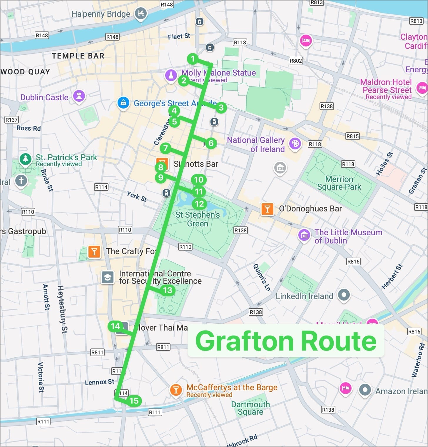 On the walk this afternoon, you'll pass Grafton Street, the Little Museum of Dublin, The National Museum, the Molly Malone Statue, George's Street arcade, the Powerscourt Townhouse centre, Stephen's Green with its buskers and the hidden Iveagh Gardens.